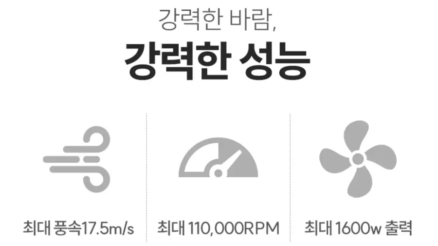 고성능 모터: 이지블로우 드라이기는 1600W의 고성능 모터를 사용하여 풍량을 최대한으로 높여 빠르고 효율적으로 건조시킬 수 있습니다.