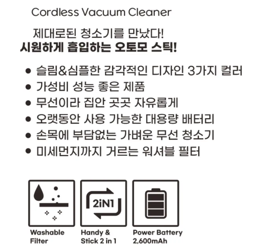 오토모 스틱 무선 청소기는 현재 저렴한가격에 판매하고 있어 더욱 매리트 있는 제품으로 할인이벤트는 기간에 따라 조기마감할 수 있고 예고없이 가격이나 할인율이 변동될 수 있습니다. 망설이면 비싸져요~ 지금사면 저렴하게 득템할 찬스입니다.