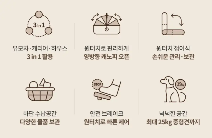 이 제품은 사용자의 편의성을 고려하여 여러 가지 기능을 갖추고 있습니다. 예를 들어, 접이식 디자인으로 보관과 이동이 용이하며, 안전벨트와 브레이크 기능을 갖추고 있어 반려동물의 안전을 보장합니다. 또한, 추가적인 보관공간을 제공하여 반려동물의 간식이나 물병, 장난감 등을 손쉽게 가지고 다닐 수 있습니다.