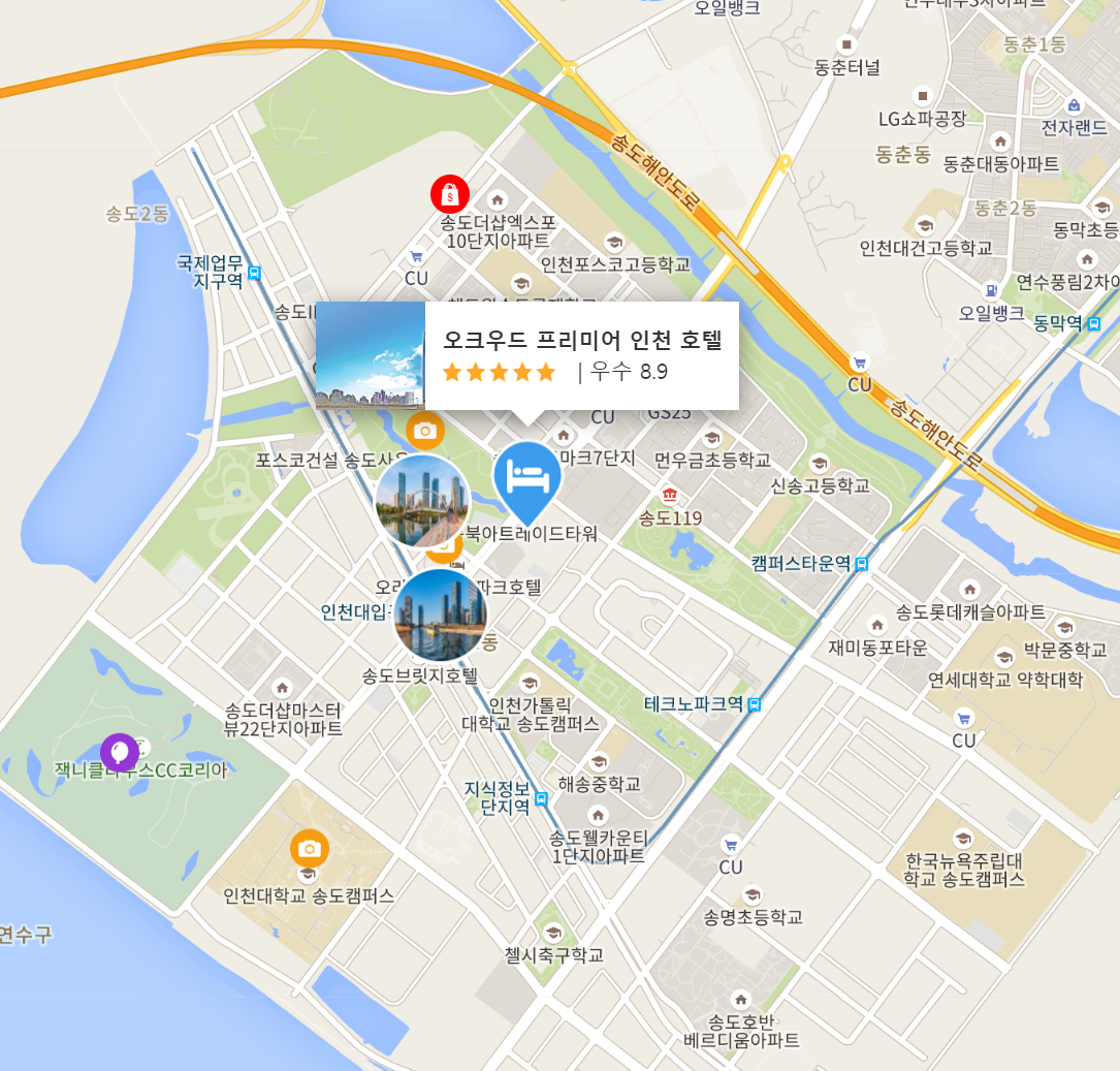 주변의 관광 명소로는 송도 센트럴 파크가 도보로 5분 거리에 있으며, 현대프리미엄아울렛과 트리플스트리트가 차로 단 5분 거리에 있어 쇼핑을 즐기기에 좋습니다.