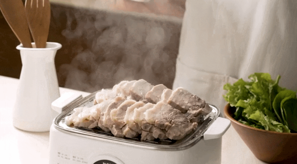 통삼겹살을 양념하여 스팀쿡에 넣고 부드럽게 찐 후, 겉은 바삭하게 구워내는 요리입니다. 채소와 함께 찌면 더욱 건강한 식사가 됩니다.
