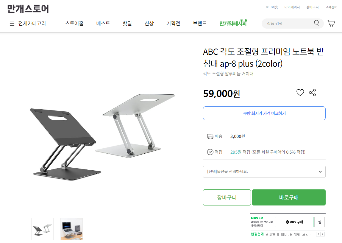 각도 조절형 알루미늄 거치대 ABC 각도 조절형 프리미엄 노트북 받침대 ap-8 plus는 만개의 레시피에서 운영하는 온라인쇼핑몰 만개스토어에서 구매하실 수 있으며, 현재의 가격은 조기마감, 이벤트할인 종료시에는 예고없이 가격이나 할인율이 변동될 수 있습니다.