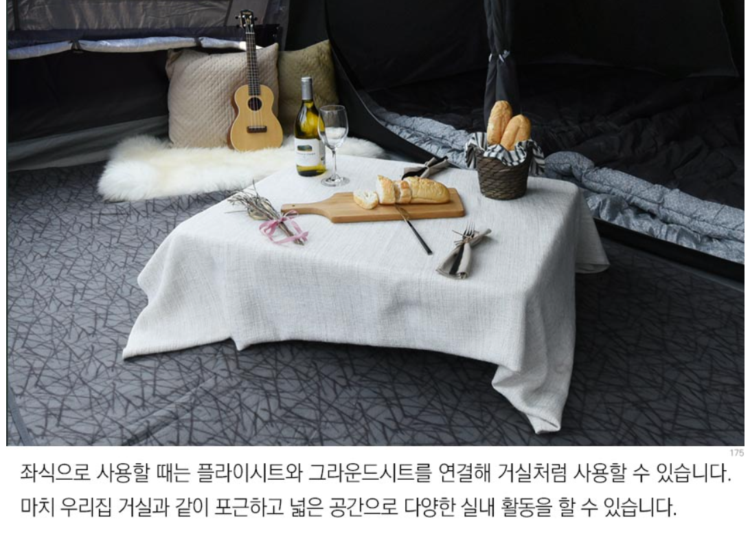 공간: 4인용 텐트로 소개되지만, 실제로는 넉넉한 공간을 제공하여 4명이 사용하기에 충분히 넓습니다. 내부 공간이 넓어 가족 단위의 캠핑이나 친구들과의 여행에 아주 적합합니다. 또한, 높은 천장으로 인해 답답함 없이 편안한 환경을 제공합니다.