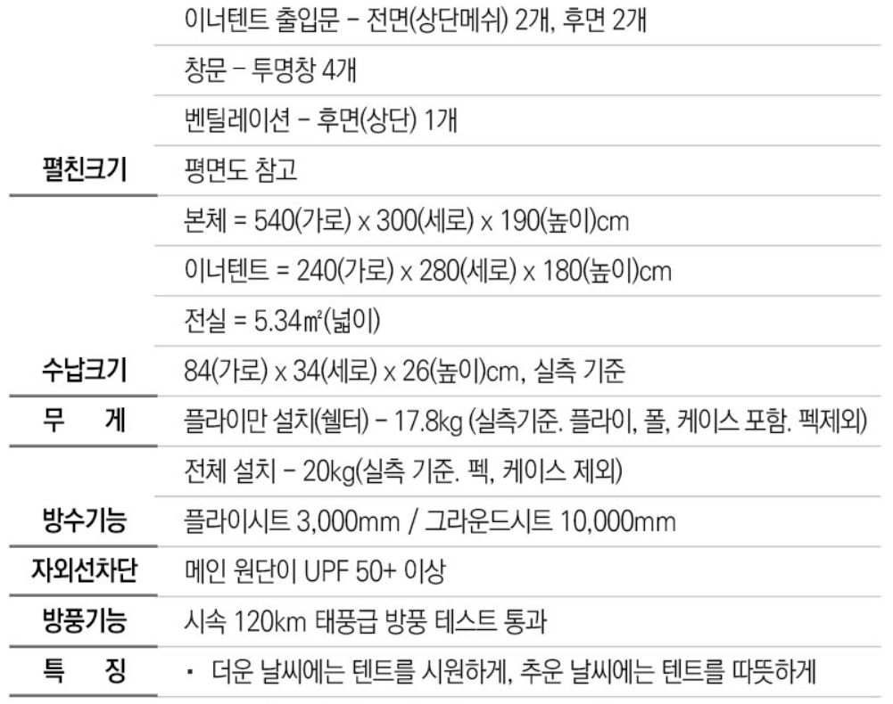 용도: 이 텐트는 주로 봄, 여름, 가을에 사용하기 적합합니다. 겨울 캠핑이나 극한의 날씨 조건에서는 추가적인 겨울용 텐트나 장비가 필요할 수 있습니다.
