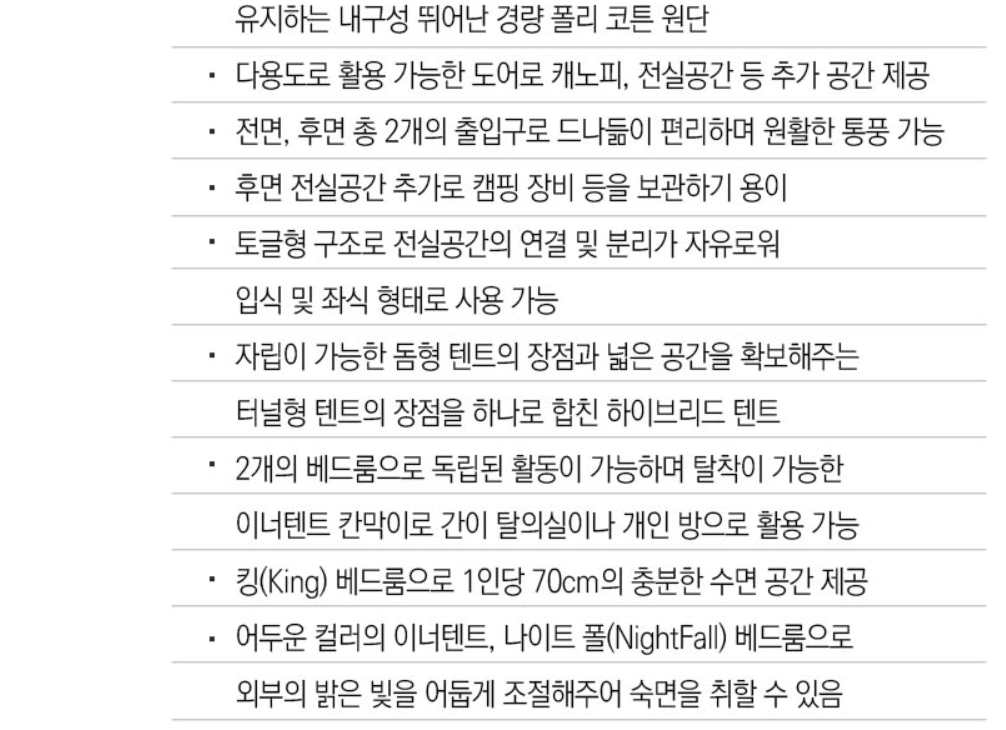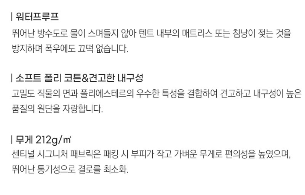 내구성: 고품질의 소재와 견고한 제작 방식 덕분에, 이 텐트는 강한 바람과 비에도 견딜 수 있는 뛰어난 내구성을 자랑합니다. 캠핑을 자주 가는 사람들에게 오랫동안 사용할 수 있는 텐트를 제공합니다.
