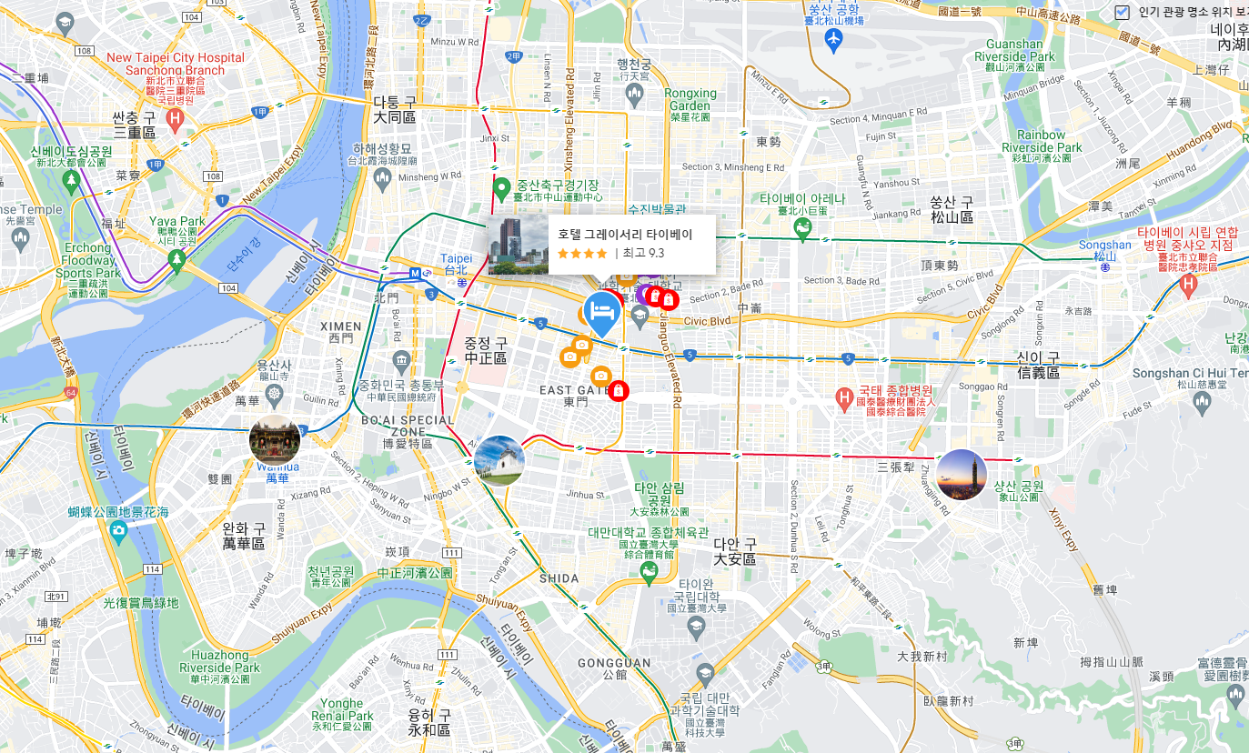 호텔 그레이서리 타이베이 (Hotel Gracery Taipei)의 객실을 예약해 타이베이 도심 속 휴식을 최대한 즐겨보세요. 도심 한가운데 있는 호텔 그레이서리 타이베이에서는 최고의 지역 중심지에서 하루를 시작할 수 있어 시간을 절약하고 더 많이 여행할 수 있습니다. 타이페이 101에서 단 3.5km 거리에 있는 호텔 그레이서리 타이베이에 머문다면 타이베이의 진정한 현지 매력과 문화를 누릴 수 있습니다.