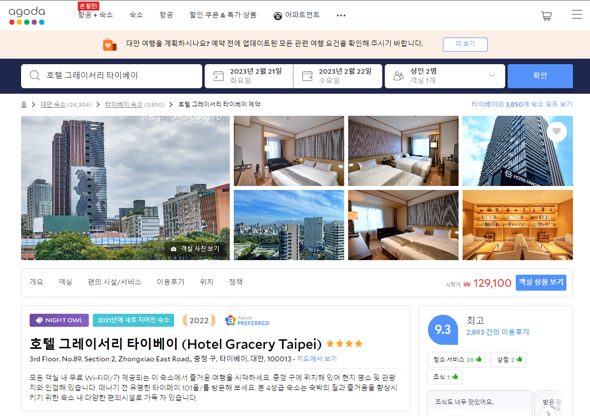 호텔 그레이서리 타이베이 (Hotel Gracery Taipei)의 최저 가격대는 아고다웹사이트에서 할인특가 가격으로 매일매일 변동되며 10만원대부터 다양하게 형성됩니다. 날짜별로 매일 가격이 다르므로 아고다웹사이트 최저가를 확인하시려면 아래 링크를 누르시고 원하는 날짜의 가격대를 선택해야 정확한 가격을 자세히 보실 수 있습니다.