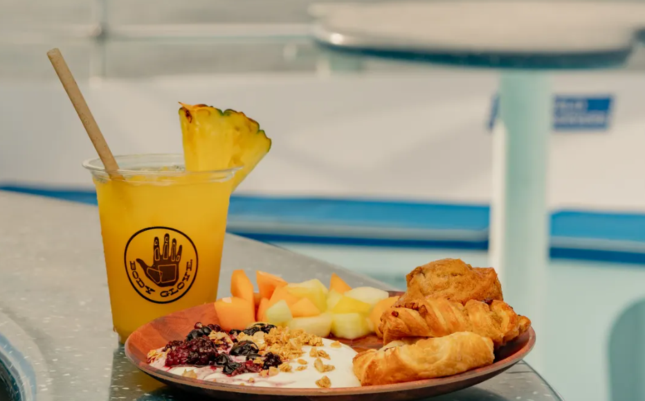 신선한 과일, 요거트, 데니쉬 및 점심 식사