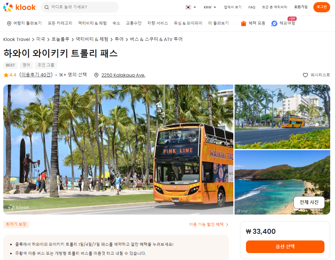 하와이 와이키키 트롤리 패스는 클룩사이트에서 쉽게 예약하실 수 있으며, 현재 할인된 금액에 이용하실 수 있습니다.
