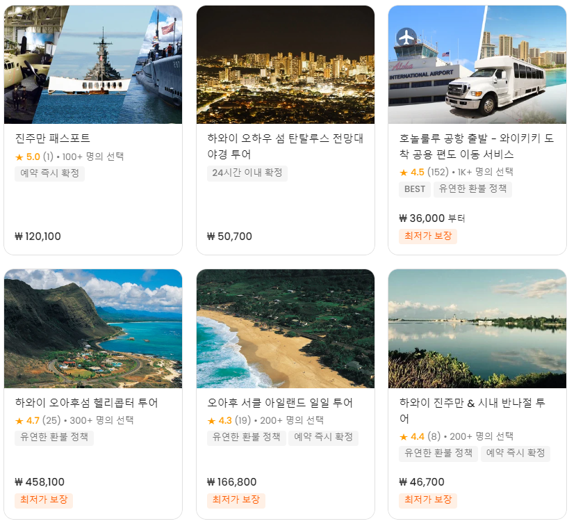 아름다운 자연환경을 자랑하는 하와이 오아후여행에 해변, 산, 정글, 계곡, 바다 등 다양한 자연환경을 만끽하며 오아후만의 독특하고 아름다운 자연을 만끽해 보세요~~ 아래 나열하는 인기여행