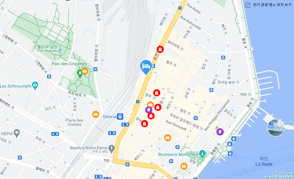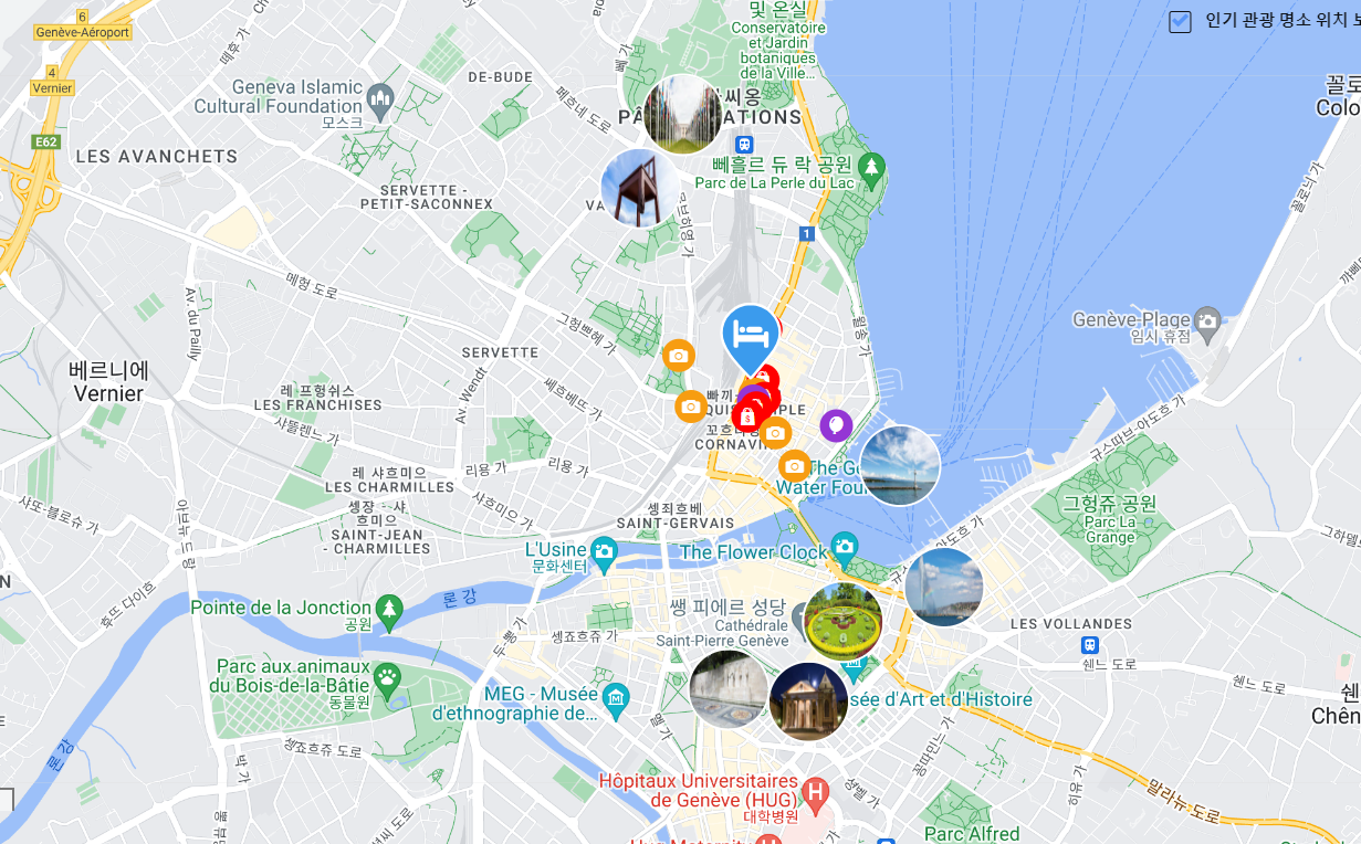 제네바는 유럽에서 가장 아름다운 도시 중 하나로 꼽히며, 방문객들에게 다양한 관광 명소와 경험을 제공합니다. Rue de Lausanne 33 주변에는 다음과 같은 여러 관광지가 있어 추천드립니다.