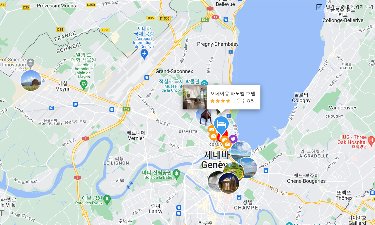 오테이유 마노텔 호텔 (Auteuil Manotel Hotel) 주변은 제네바 호수, 유명한 제테 분수, 유엔 본부 등 제네바의 대표적인 관광 명소들로 둘러싸여 있어, 도보나 대중교통을 이용해 쉽게 이동할 수 있는 편리한 위치를 자랑합니다. 또한, 호텔 주변에는 쇼핑을 즐길 수 있는 명품 매장들, 다양한 요리를 맛볼 수 있는 식당들 그리고 편안한 분위기의 카페들이 즐비해, 제네바에서의 생활을 한층 더 풍부하게 만들어 줍니다.