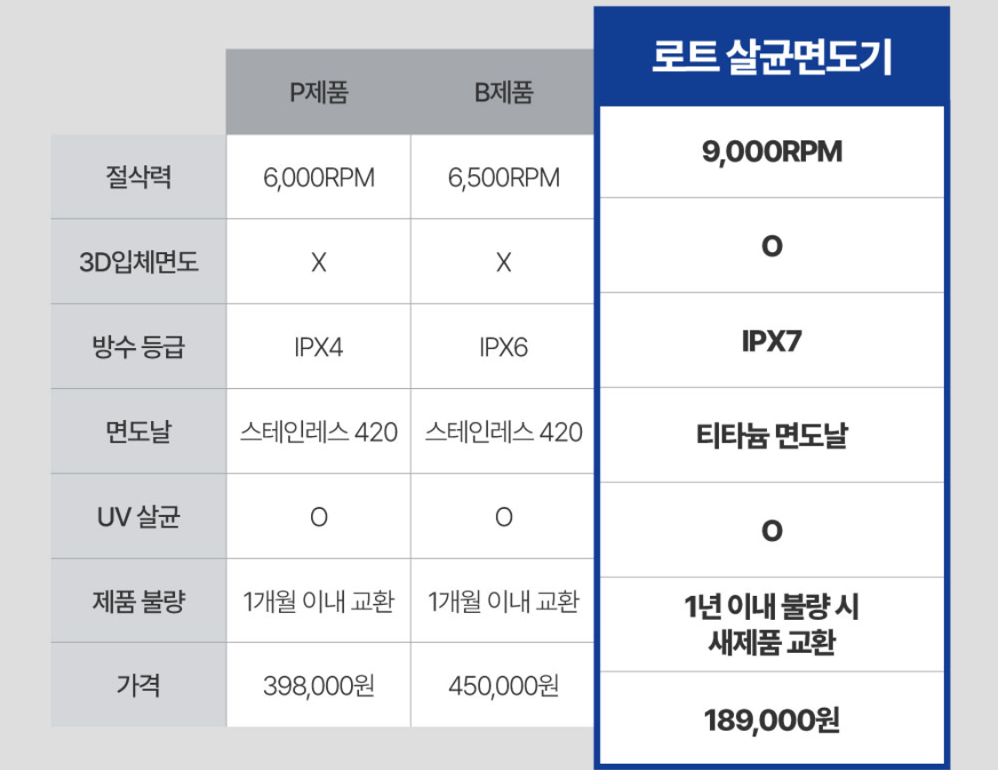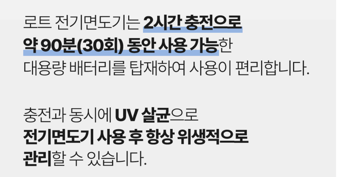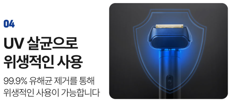 UV살균 기능: 이 면도기는 UV살균 기능을 갖추고 있어, 사용 후 면도날에 남아있는 세균을 제거해줍니다. 이 기능은 피부건강을 위해 중요한 역할을 합니다.