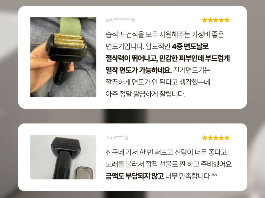 젖은 피부에서도 사용 가능: 이 면도기는 젖은 피부에서도 사용할 수 있어, 샤워 중이나 목욕 후에도 편리하게 사용할 수 있습니다.
