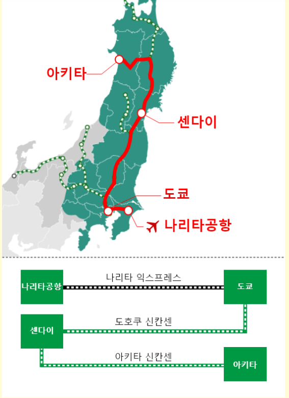 저렴한 가격 예시: 나리타공항역을 출발하여 도쿄를 경유해서 센다이 및 아키타를 여행할 경우