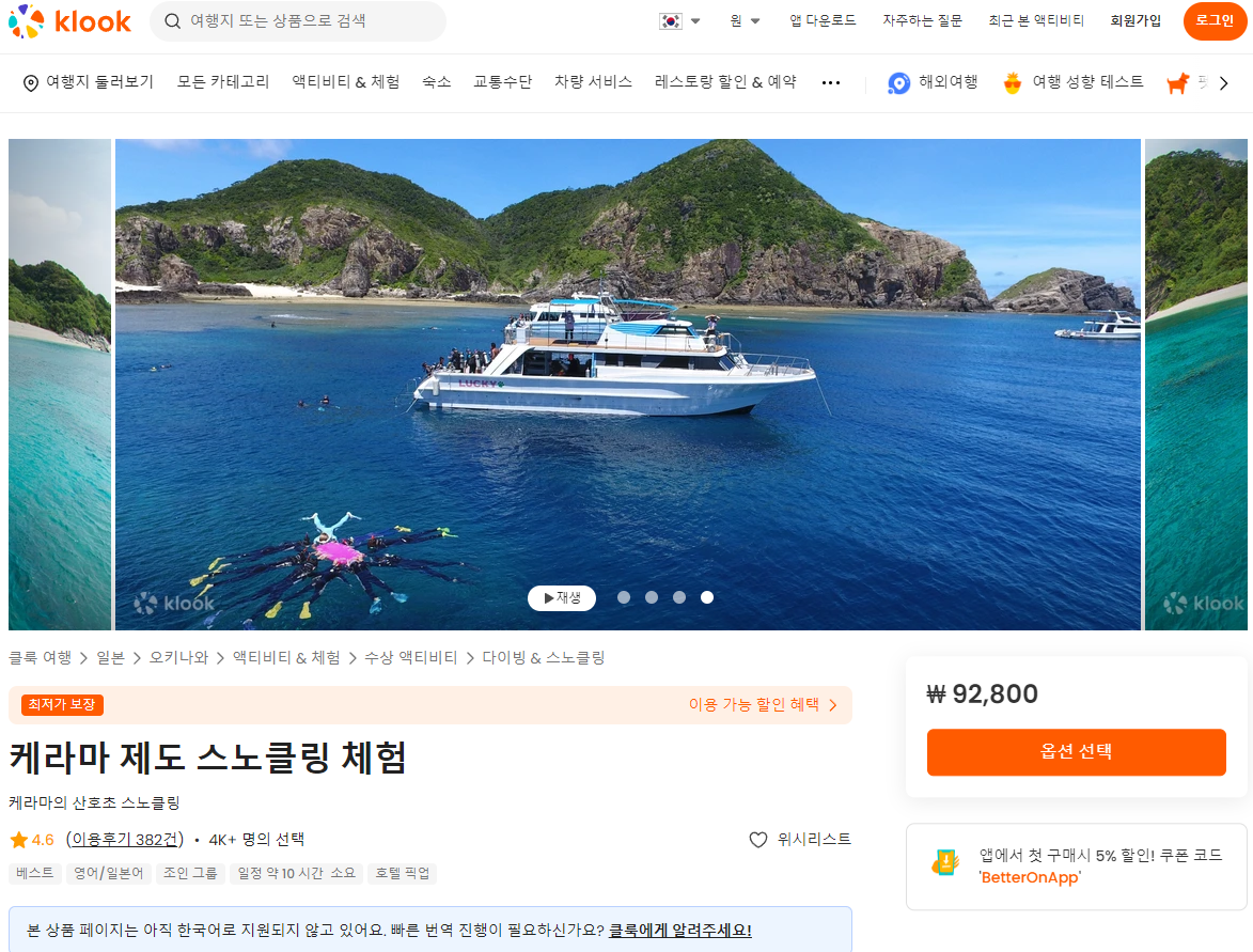 오키나와 나하출발 케라마 제도 스노클링 체험 투어는 클룩사이트에서 쉽게 예약하실 수 있으며, 현재 할인된 금액에 이용하실 수 있습니다.