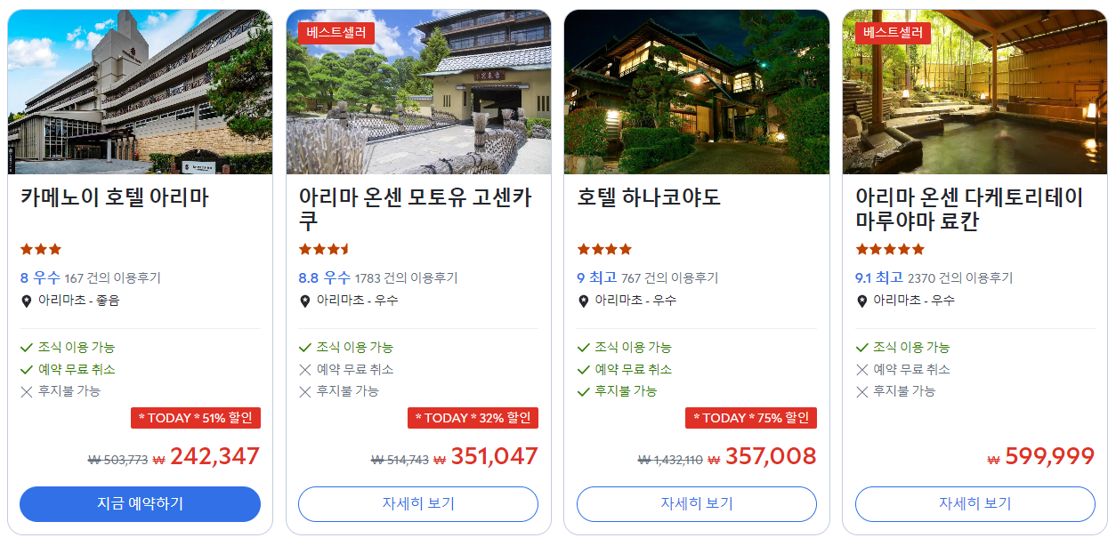 아리마료칸 카메노이 호텔 아리마 (KAMENOI HOTEL ARIMA)의 최저 가격대는 아고다웹사이트에서 할인특가 가격으로 매일매일 변동되며 10만원대부터 다양하게 형성됩니다. 날짜별로 매일 가격이 다르므로 아고다웹사이트 최저가를 확인하시려면 아래 링크를 누르시고 원하는 날짜의 가격대를 선택해야 정확한 가격을 자세히 보실 수 있습니다.