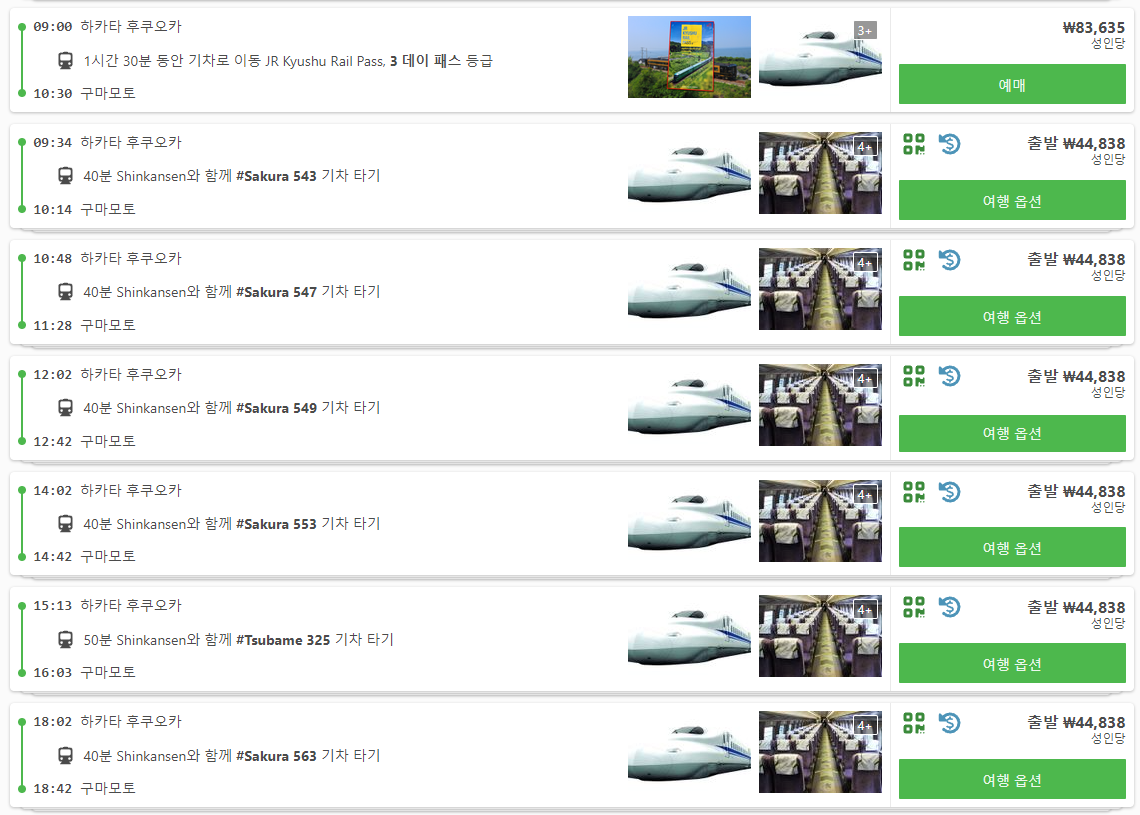 후쿠오카(fukuoka)에서 구마모토(kumamoto)로 이동하는 신칸센(Shinkansen)은 최소 40분부터 ~ 최대 1시간 30분까지 이동시간이 소요되며 후쿠오카 하카타역에서 구마모토역으로 이동합니다. 후쿠오카에서 구마모토로 이동하는 신칸센 편도는 4만원대에 이용하실 수 있습니다. 예약되지 않은 자석은 44,838원, 스탠다드좌석은 47,987원입니다. 온라인 예약사이트에서 노선을 검색하시면 8만원대 요금도 있는데 이건 3일패스로 3일동안 북부 큐슈 지역의 모든 JR 큐슈 열차를 무제한으로 탑승할 수 있습니다.