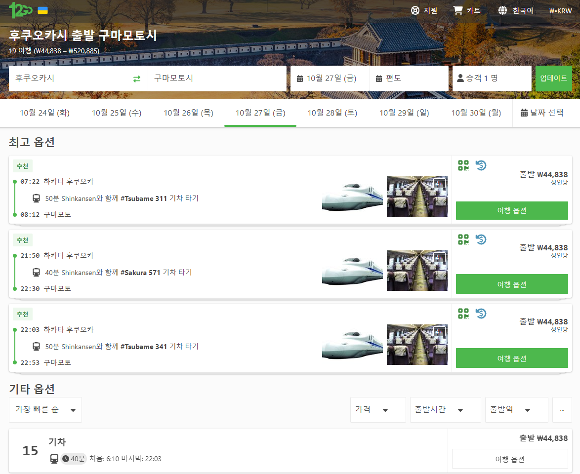 후쿠오카(fukuoka)에서 구마모토(kumamoto) 이동하는 교통편 노선정보 및 예약은 12go사이트에서 예약하실 수 있으며, 이 노선 뿐만아니라 나라전역의 노선, 나라간 노선의 검색가능한 모든 교통편을 검색하고 예약하실 수 있습니다. 한국어로 검색해보시고 나오지 않으면 영어로 검색하시면 보다 쉽게 노선을 확인하실 수 있습니다.