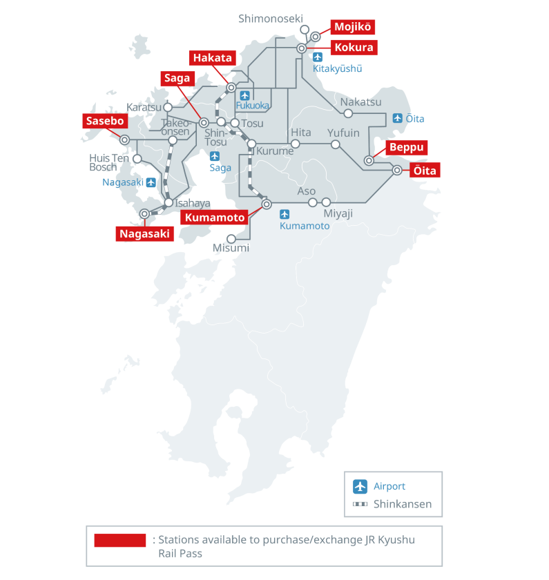 Main stations: Fukuoka, Nagasaki, Shimonoseki, Mojiko, Kokura, Hakata, Yufuin, Beppu, Oita, Kumamoto, Aso, Saga, Huis Ten Bosch, and Sasebo.