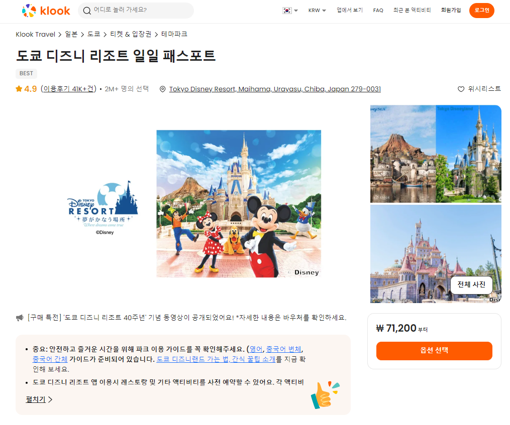 도쿄디즈니리조트 입장권(일일패스포트)은 클룩사이트에서 쉽게 예약하실 수 있으며, 현재 할인된 금액에 이용하실 수 있습니다. 내용 및 요금은 항상 변경될 수 있으니 예약사이트에서 정확한 내용을 확인하셔야 합니다.