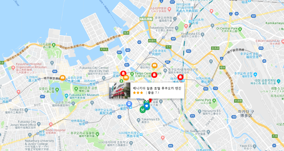 주변 교통은 텐진역, 하카타역 모두 가깝고, 오호리 공원 등 관광지로 가는 버스도 근처에 있고, 후쿠오카지역의 숙박비가 대체적으로 비싼걸 생각하면 10만원도 안되는 가성비 좋은 베니키아 칼튼 호텔 후쿠오카 텐진(Benikea Calton Hotel Fukuoka Tenjin)입니다.