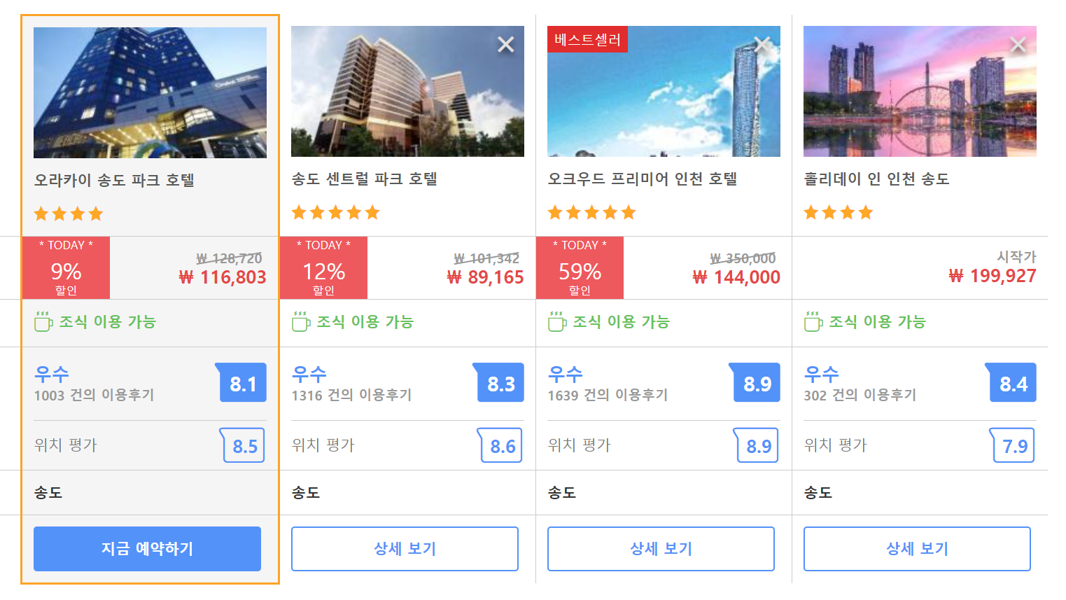 오라카이 송도 파크 호텔 (Orakai Songdo Park Hotel)의 최저 가격대는 아고다에서 할인특가 가격으로 매일매일 변동되며 20만원대부터 다양하게 형성됩니다. 아고다 최저가를 확인하시려면 아래 링크를 누르시면 원하는 날짜의 가격대를 자세히 보실 수 있습니다.