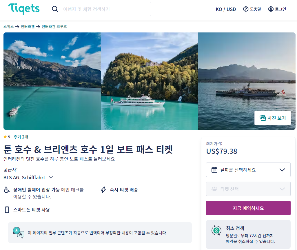 툰 호수 & 브리엔츠 호수 1일 보트 패스 티켓은 tigets 온라인 사이트에서 간편하게 예약하실 수 있으며 이메일, 페이스북, 구글 아이디로 쉽게 회원가입이 가능합니다.