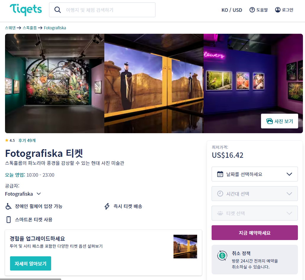 스톡홀름의 포토그라피스카 미술관 (Fotografiska Museum) 티켓은 tigets 온라인 사이트에서 간편하게 예약하실 수 있으며 이메일, 페이스북, 구글 아이디로 쉽게 회원가입이 가능합니다.