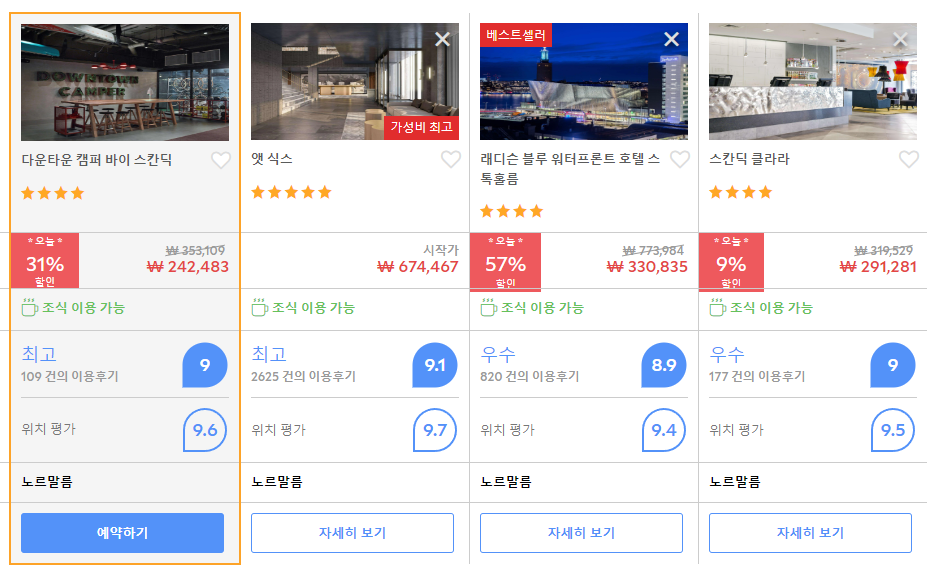 스톡홀름호텔 다운타운 캠퍼 바이 스칸딕 (Downtown Camper by Scandic)의 최저 가격대는 아고다웹사이트에서 할인특가 가격으로 매일매일 변동되며 20만원대부터 다양하게 형성됩니다. 날짜별로 매일 가격이 다르므로 아고다웹사이트 최저가를 확인하시려면 아래 링크를 누르시고 원하는 날짜의 가격대를 선택해야 정확한 가격을 자세히 보실 수 있습니다.