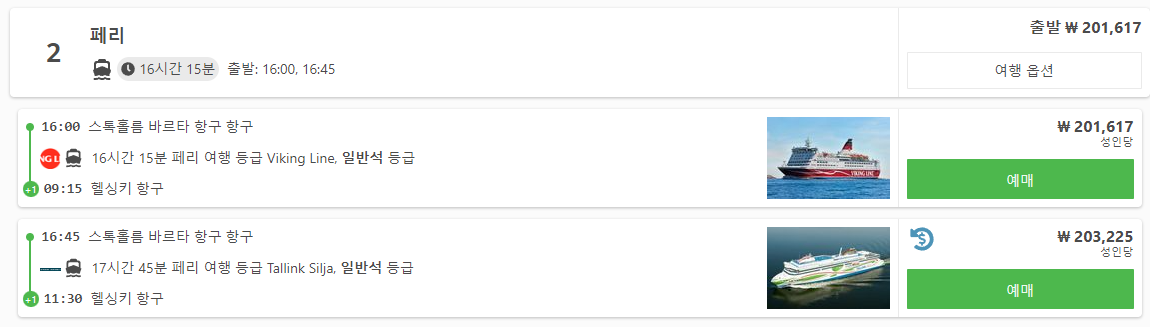 스톡홀름에서 헬싱키로 가는 페리는 Stockholm Vartahamnen Port에서 출발하여 Helsinki Port에 도착하며 viking line, tallink silja 회사 페리 노선이 있습니다. 16시간이상 걸리는 만큼 오후에 출발하여 다음날 오전에 도착하는 스케줄로 1박을 페리내에서 지내시면 됩니다. 페리는 1시간 전에 도착해서 체크인하시면 됩니다.