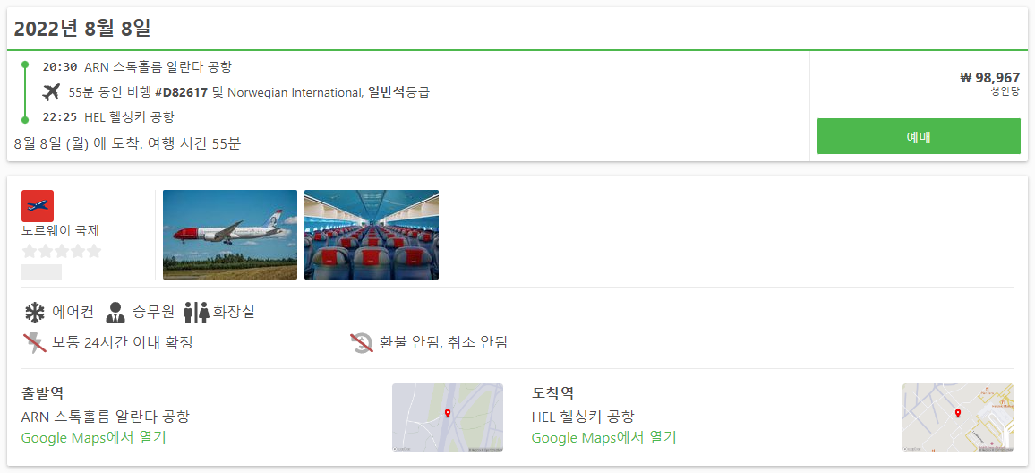 북유럽을 여행하며 스웨덴 스톡홀름에서 핀란드 헬싱키로 이동하는 방법으로는 페리와 항공편을 이용하실 수 있으며 Norwegian International 항공을 이용하시면 최저 98,967원에 이용하실 수 있으며, 1시간내에 이동하실 수 있고, 페리는 20만원대에 16~18시간정도 소요됩니다.