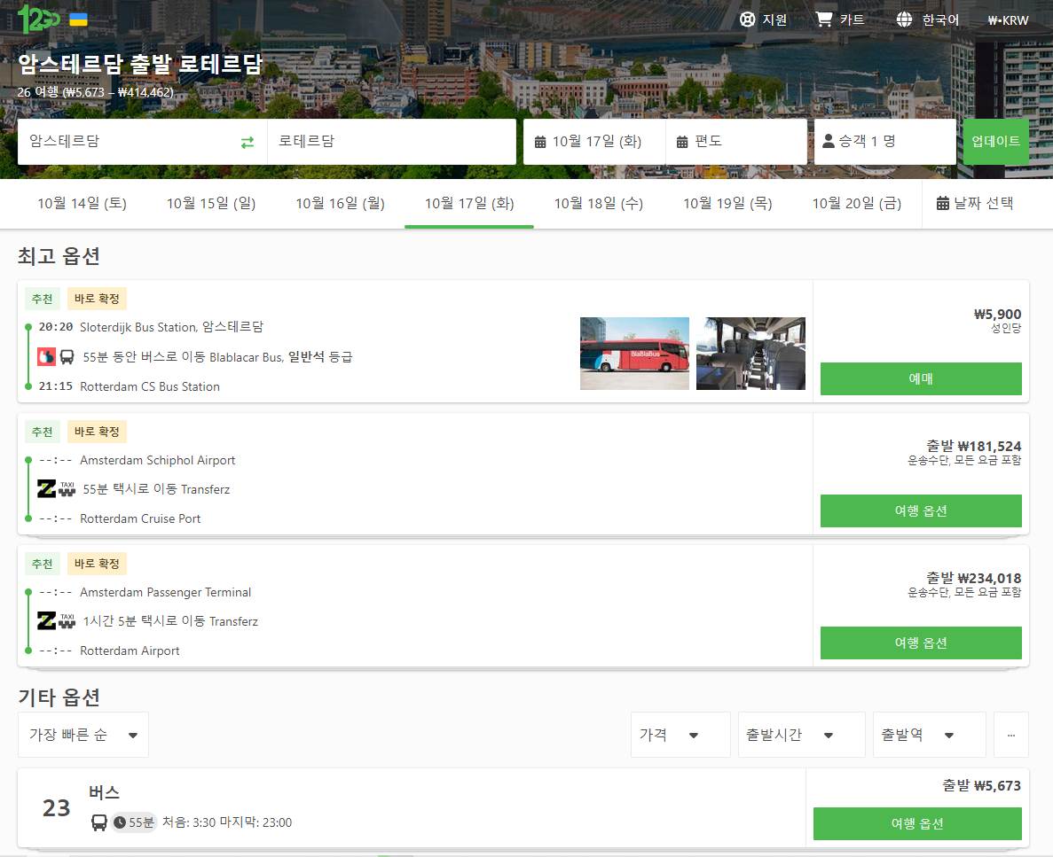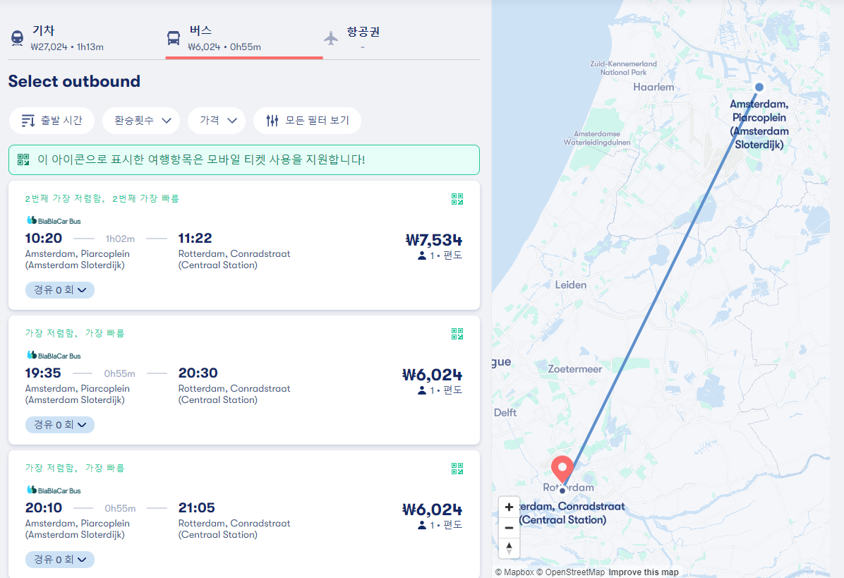 암스테르담에서 로테르담으로 이동하는 교통편 노선정보 및 예약은 12go사이트와 omio 사이트에서 예약하실 수 있으며, 이 노선 뿐만아니라 나라전역의 노선, 나라간 노선의 검색가능한 모든 교통편을 검색하고 예약하실 수 있습니다. 한국어로 검색해보시고 나오지 않으면 영어로 검색하시면 보다 쉽게 노선을 확인하실 수 있습니다. 사이트를 함께 비교해서 가성비 좋은 교통편을 이용하시는 것이 좋습니다.