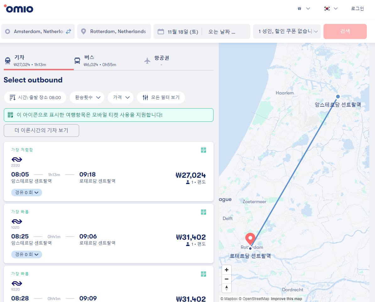 OMIO 사이트에서 암스테르담에서 로테르담으로 이동하는
