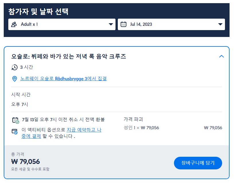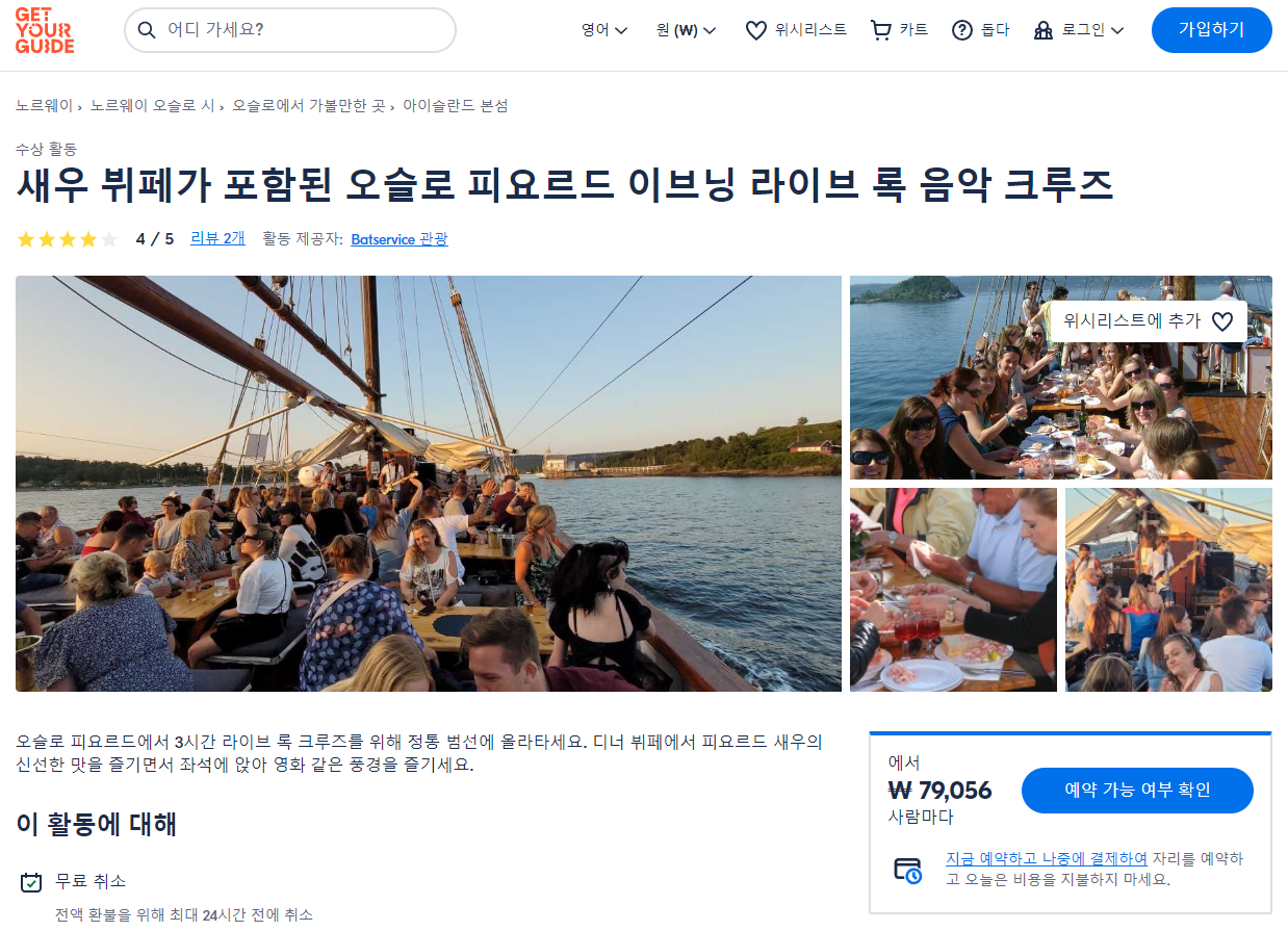 오슬로 새우 뷔페가 포함된 오슬로 피요르드 이브닝 라이브 록 음악 크루즈(Oslo Fjord Evening Live Rock music cruise with Shrimp buffet)는 GET YOUR GUIDE 사이트에서 예약하실 수 있습니다. 사이트는 특히 전세계 대부분의 나라, 지역의 투어, 교통편 있어, 쉽게 찾을 수 없는 여행지의 다양한 투어 및 서비스를 이용할 수 있는 글로벌 사이트로 한국어사이트는 지원하지 않습니다. (글로벌 한국어 여행사이트를 찾으신다면 klook 여행사이트 추천합니다. 함께 사용하시면 더욱 편하게 여행하실 수 있습니다. klook에 찾는 정보가 없다면 GET YOUR GUIDE에서 찾으시면 됩니다.)