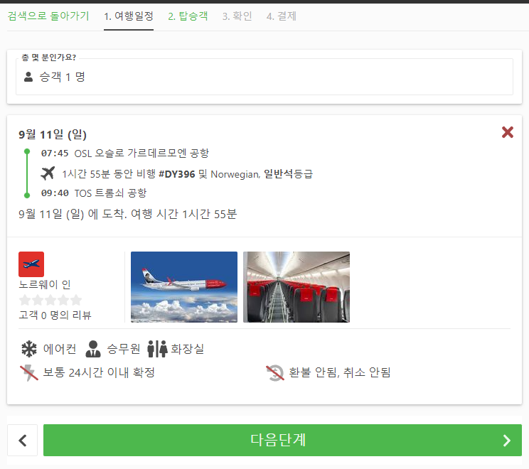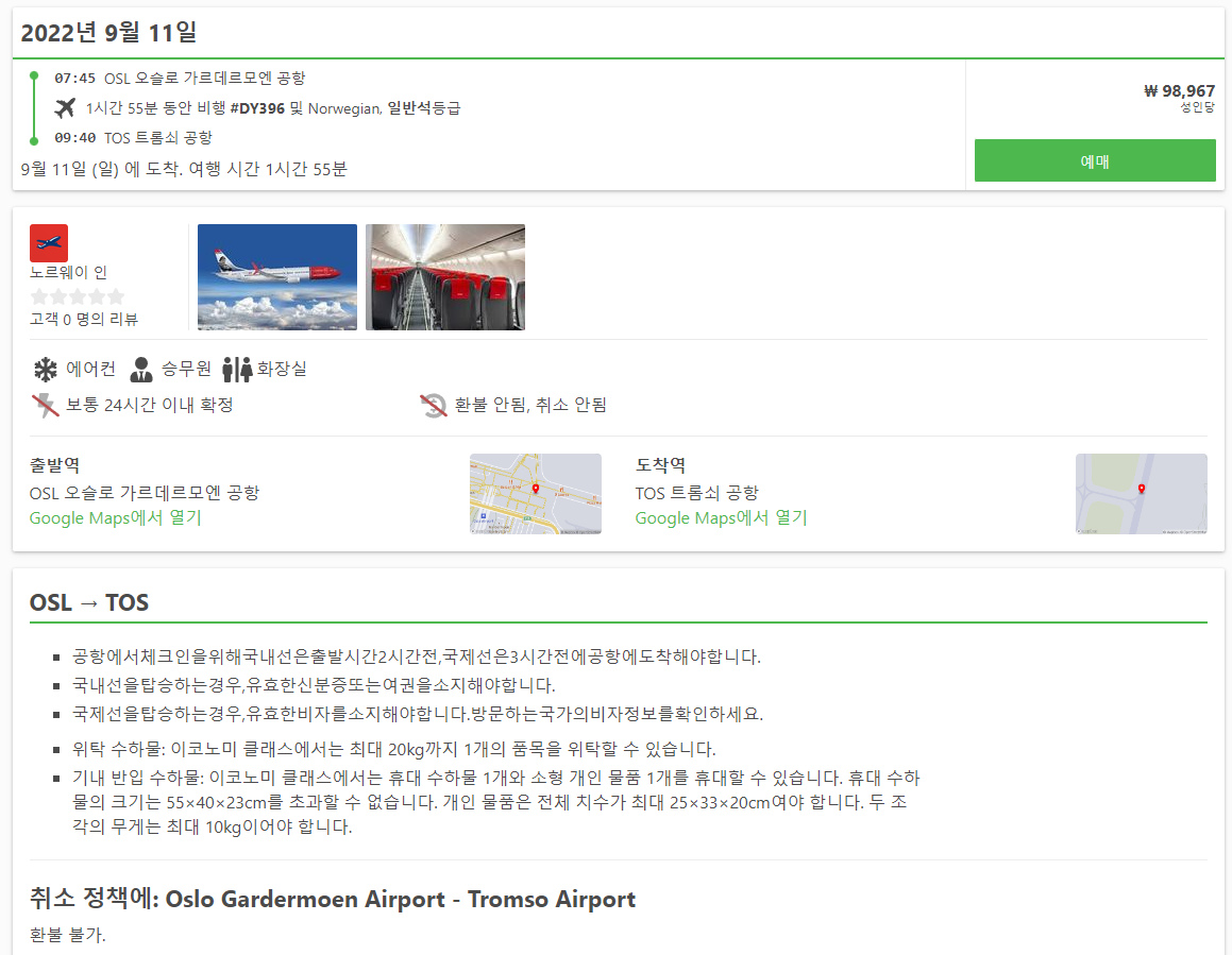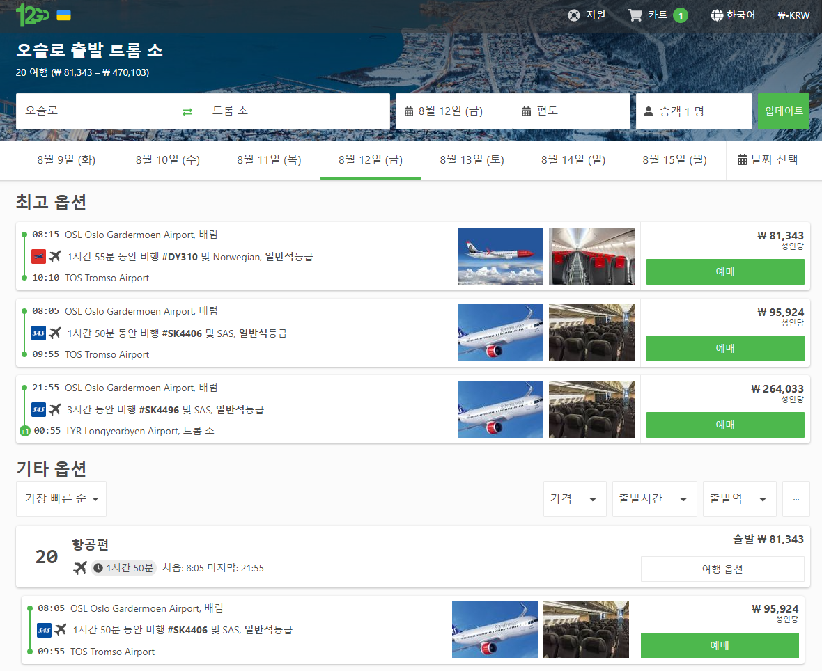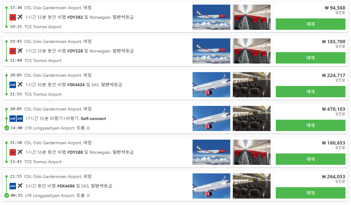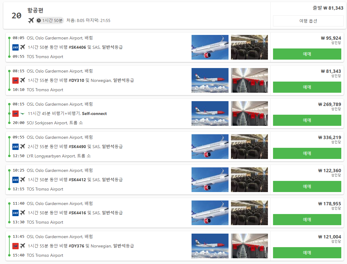 노르웨이여행에 수도 오슬로(oslo)에서 트롬쇠(tromso)로 이동하는 국내선비행기 요금은 최저 6만원대에도 나오기는 하지만 금방 매진되어서 예약하기 힘들고 8~9만원대는 그나마 좌석이 많이 있습니다. 요금은 최대 30만원대까지 다양합니다.