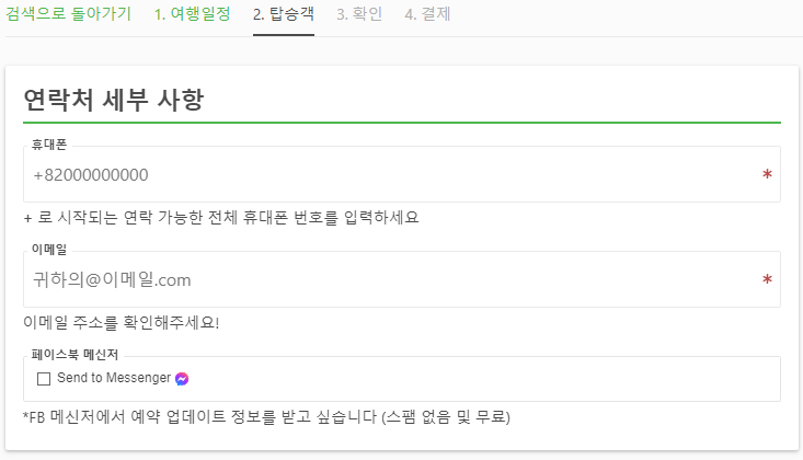 예약시에는 휴대폰넘버, 이메일, 이름, 성, 성별, 생년월일, 국가, 여권번호을 입력하고, 기내수화물만 무료, 추가수화물을 유료로 추가하실 수 있습니다. 그리고 여행자보험은 선택사항입니다.