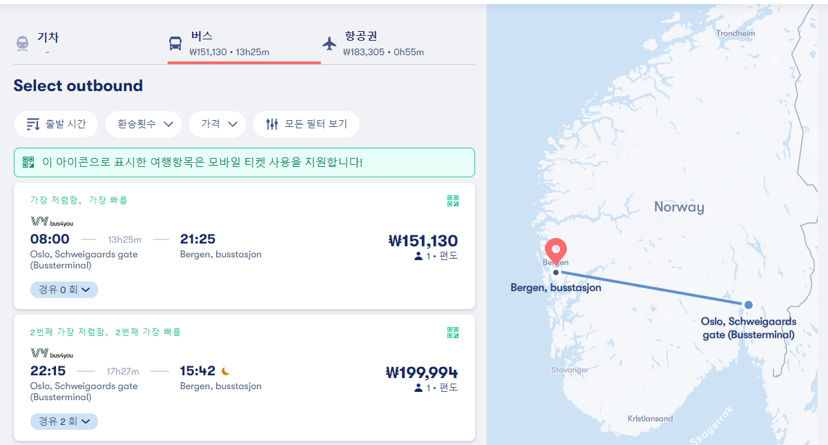 #오슬로에서베르겐버스노선 #오슬로에서베르겐버스요금