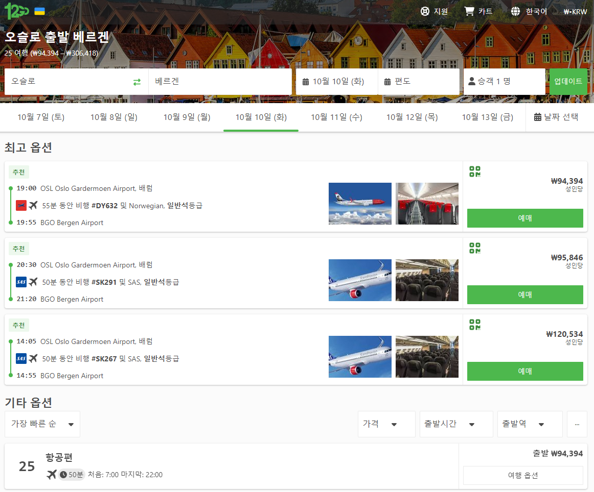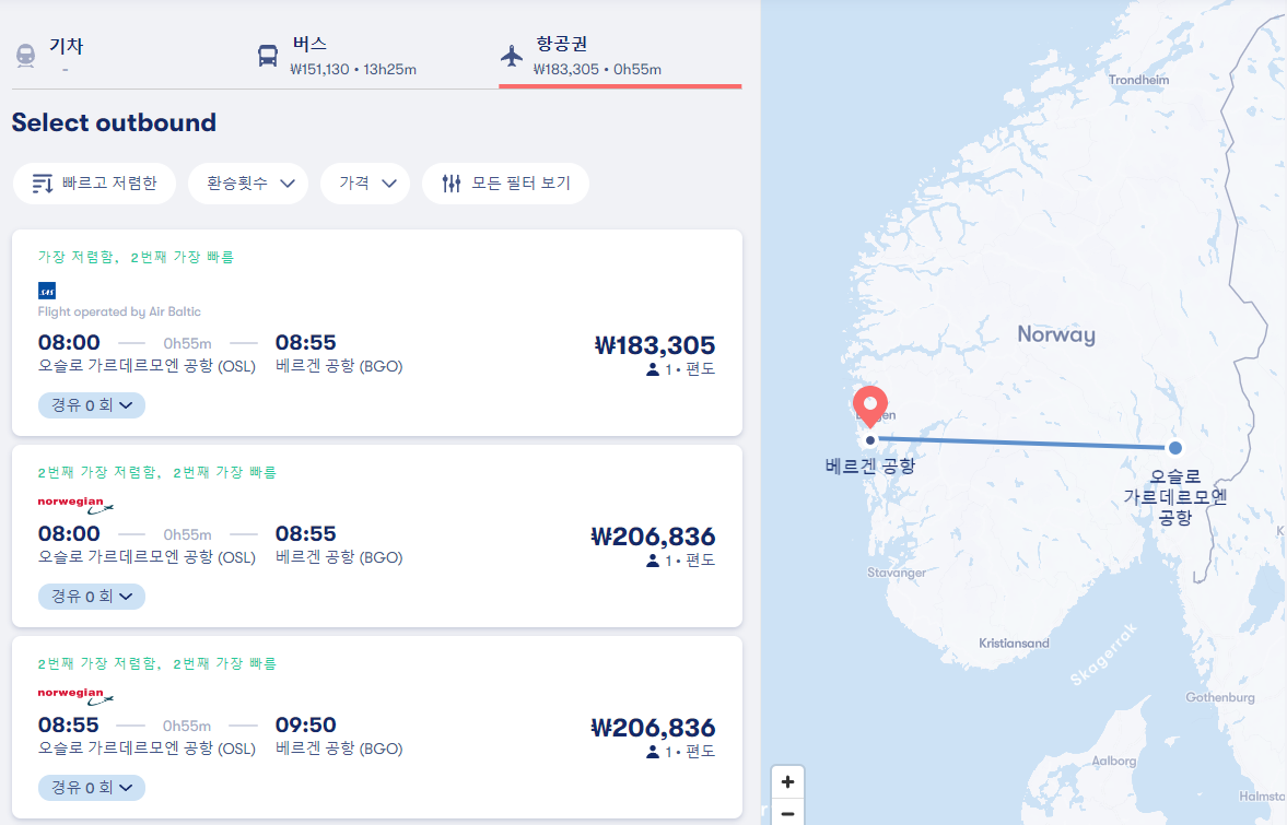 오슬로에서 베르겐으로 이동하는 교통편은 유명한 12go사이트와 omio 사이트를 함께 비교해서 가성비 좋은 교통편을 이용하시는 것이 좋습니다.