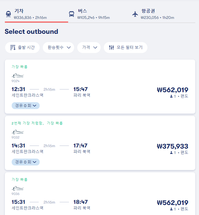 OMIO 사이트에서 런던에서 파리로 이동하는 교통편 자세히 보기
