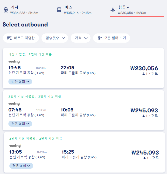 런던에서 파리로 가는 항공은 런던 개트윅공항에서 파리 오를리 공항, 런던루턴공항에서 파리 샤를드골공항, 런던히드로공항에서 파리 샤를 드골공항으로 이동하는 노선이 있으며 최저요금 230,246원부터 시간대, 항공에 따라 요금이 상이하며 항공사는 vueling, easyjet, birtish airways 등이 있습니다.