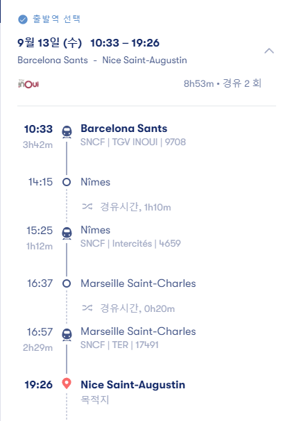 바르셀로나에서 니스로 이동하는 기차는 약 9시간정도 이동시간이 소요되며 현재 NIMES, 마르세유를 경유해서 이동합니다. 요금은 20만원대입니다.
