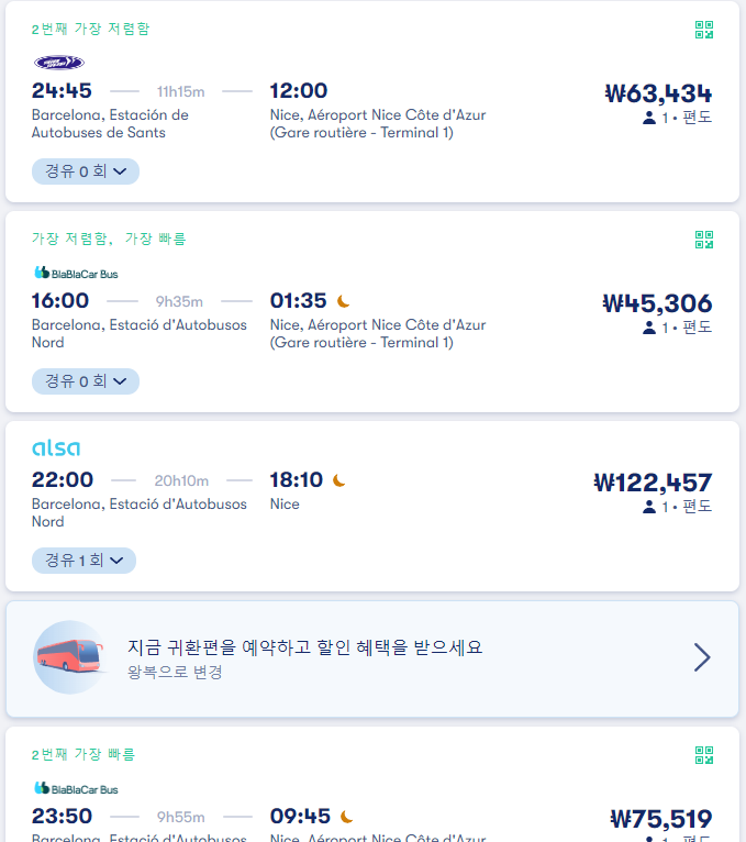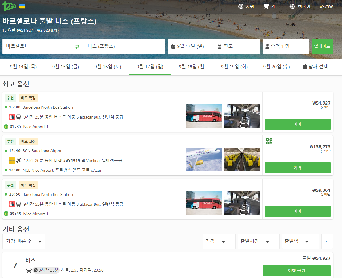 바르셀로나에서 니스로 이동하는 교통편은 유명한 12go사이트를 비롯해 , omio 사이트를 함께 비교해서 가성비 좋은 교통편을 이용하시는 것이 좋습니다.