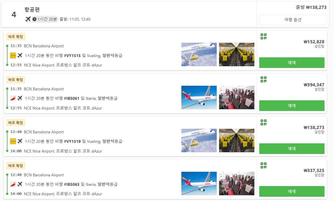 바르셀로나에서 니스로 이동하는 비행기는 최저요금 2만원대에 VUELING.COM, EASY JET 항공을 이용하여 이동하실 수 있고 이동시간은 1시간 20분으로 이 최저가요금으로 이동한다면 최선의 선택이 되실 겁니다.