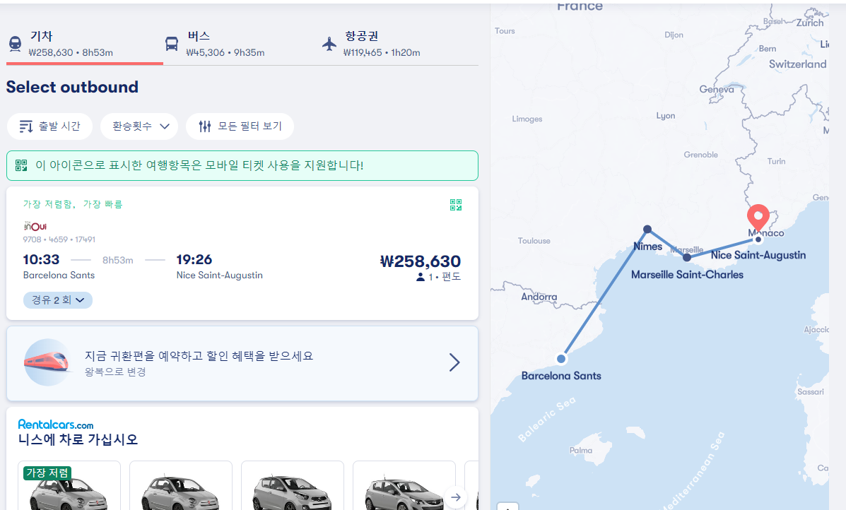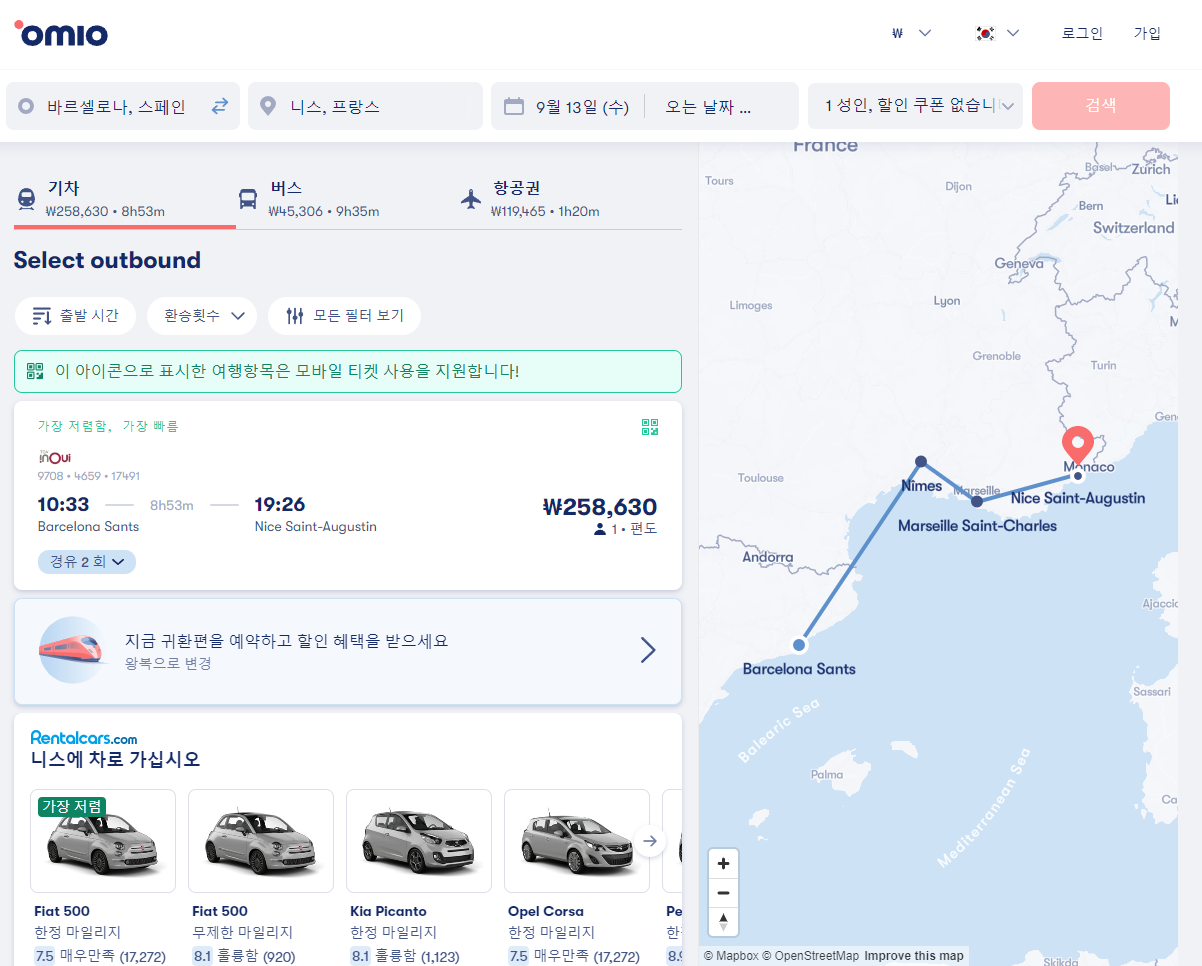 OMIO 사이트에서 바르셀로나에서 니스로 이동하는