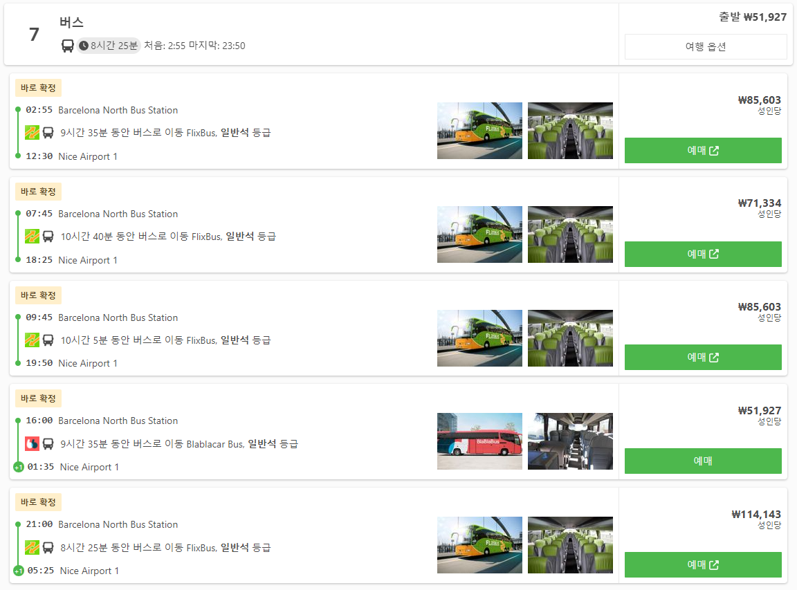 바르셀로나에서 니스로 이동하는 버스는 오전 2시 55분부터 23시 50분까지 평균 7편정도 운행하며 이동시간은 가장빨리 도착하는 시간대가 8시간 25분입니다. 시간대에 따라 요금이 조금씩 다르며 최저요금은 4~5만원대입니다.