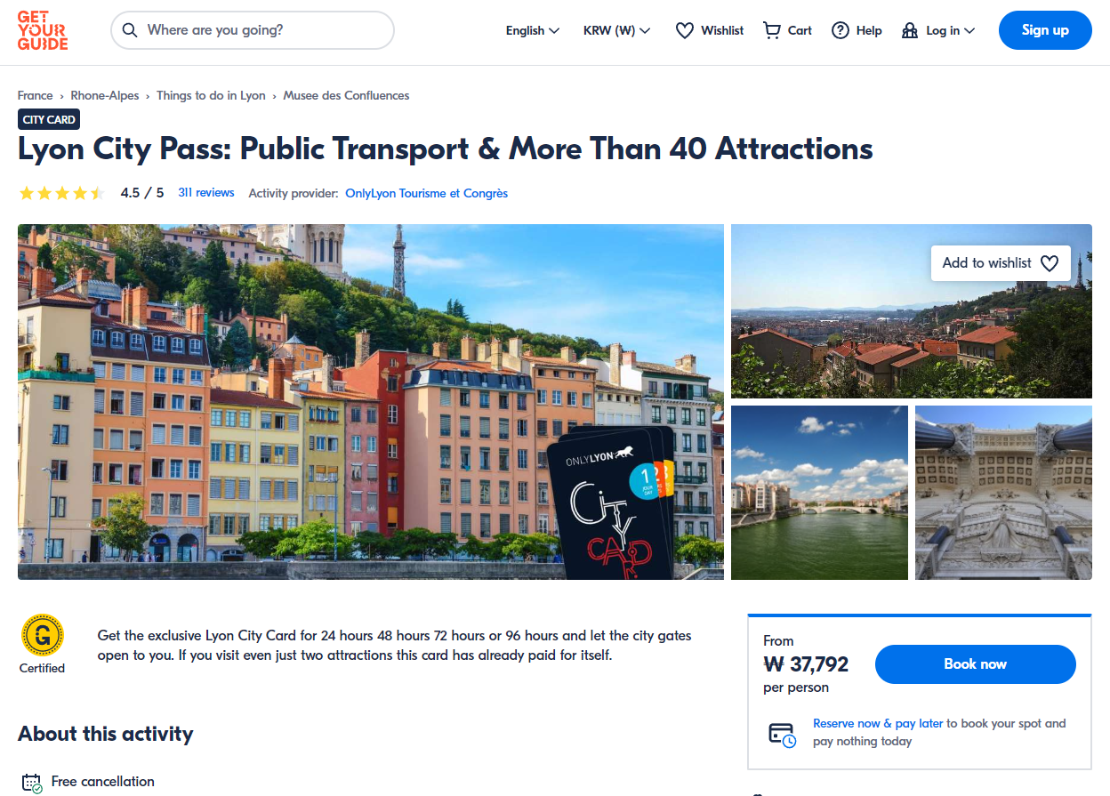 리옹 시티 패스는 GET YOUR GUIDE 사이트에서 예약하실 수 있습니다. 사이트는 특히 전세계 대부분의 나라, 지역의 투어, 교통편 있어, 쉽게 찾을 수 없는 여행지의 다양한 투어 및 서비스를 이용할 수 있는 글로벌 사이트로 한국어사이트는 지원하지 않습니다. (글로벌 한국어 여행사이트를 찾으신다면 klook 여행사이트 추천합니다. 함께 사용하시면 더욱 편하게 여행하실 수 있습니다. klook에 찾는 정보가 없다면 GET YOUR GUIDE에서 찾으시면 됩니다.)