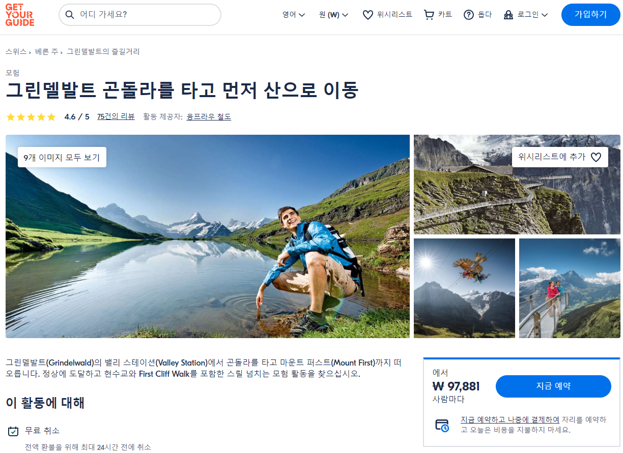 그린델발트 곤돌라 입장권 (Grindelwald Gondola)과 퍼스트 클리프 워크(First Cliff Walk) 입장권 통합 티켓은 GET YOUR GUIDE 사이트에서 예약하실 수 있습니다. 사이트는 특히 전세계 대부분의 나라, 지역의 투어, 교통편 있어, 쉽게 찾을 수 없는 여행지의 다양한 투어 및 서비스를 이용할 수 있는 글로벌 사이트로 한국어사이트는 지원하지 않습니다. (글로벌 한국어 여행사이트를 찾으신다면 klook 여행사이트 추천합니다. 함께 사용하시면 더욱 편하게 여행하실 수 있습니다. klook에 찾는 정보가 없다면 GET YOUR GUIDE에서 찾으시면 됩니다.)