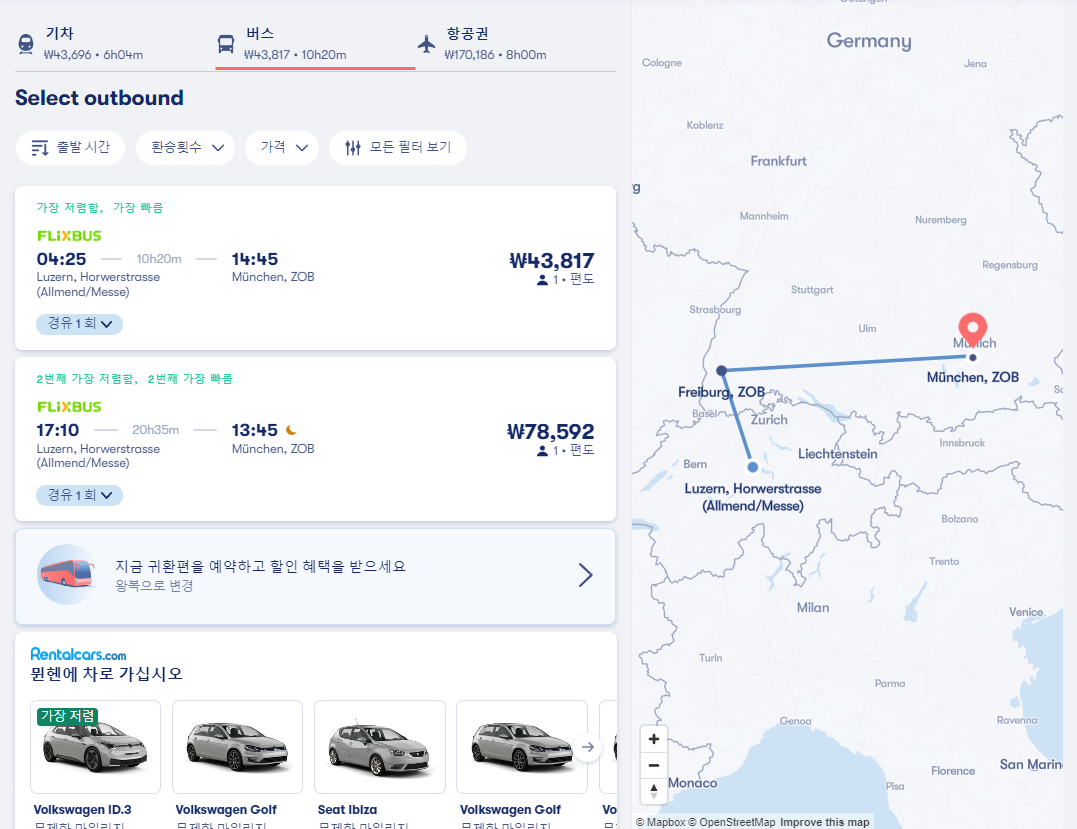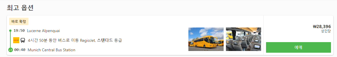루체른에서 뮌헨으로 가는 버스는 최저 2만원대부터 있으며 제일 빠른 이동시간이 4시간 50분입니다. 직행과 경유하는 버스도 있으며 온라인 예약사이트에서 검색시 날짜나 요일에 따라 검색이 안될 수 도 있습니다.
