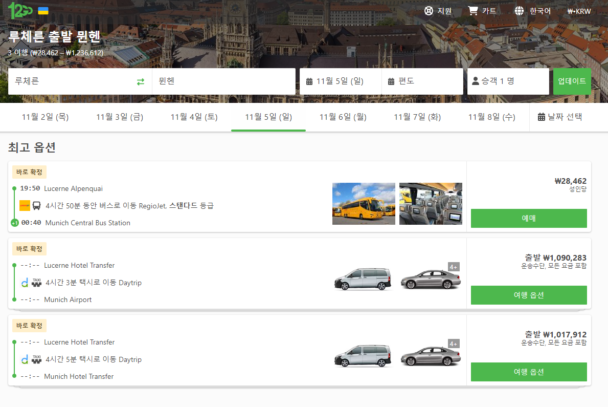 루체른에서 뮌헨으로 이동하는 교통편 노선정보 및 예약은 12go사이트와 omio 사이트에서 예약하실 수 있으며, 이 노선 뿐만아니라 나라전역의 노선, 나라간 노선의 검색가능한 모든 교통편을 검색하고 예약하실 수 있습니다. 한국어로 검색해보시고 나오지 않으면 영어로 검색하시면 보다 쉽게 노선을 확인하실 수 있습니다. 사이트를 함께 비교해서 가성비 좋은 교통편을 이용하시는 것이 좋습니다.